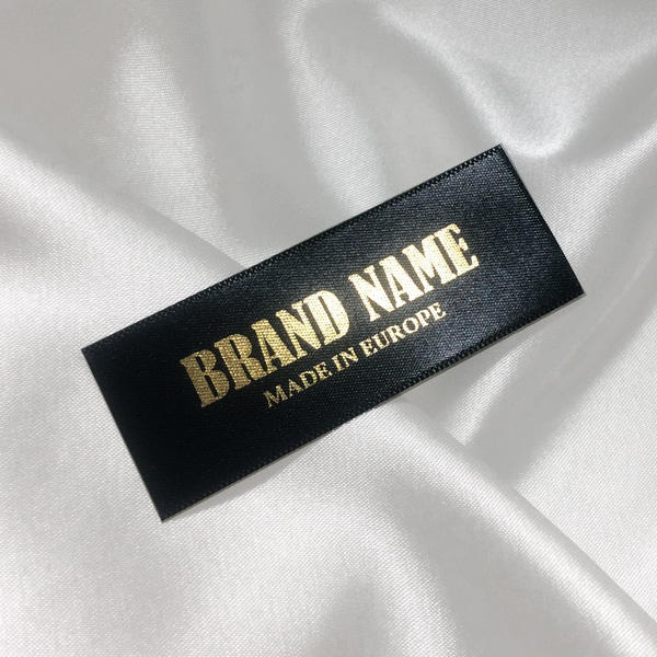 Textiletikett gedruckt mit dem Markennamen mit goldener schrift auf einem feinen Satin von schwarzer farbe, ideal für kleidung. Dieses Modell eines Textiletiketts wird mit den modernsten Technologien im Bereich des Digitaldrucks auf Textilmedien hergestellt. Die Etiketten werden im Thermotransfer-Verfahren auf Spezialsatin gedruckt, das sich durch eine beeindruckende Druckqualität und hohe Waschbeständigkeit auszeichnet. Die gedruckten Etiketten werden automatisch entsprechend den angegebenen Maßen geschnitten.
