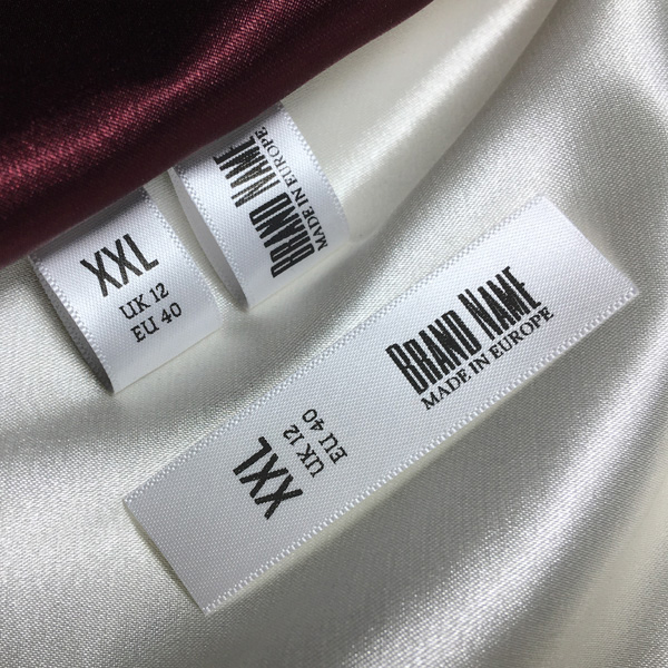 Etikett für Größe auf satin gedruckt, personalisierte mit Markennamen oder Logo auf der rückseite, ideal für kleidung. Dieses Modell eines Textiletiketts wird mit den modernsten Technologien im Bereich des Digitaldrucks auf Textilmedien hergestellt. Die Etiketten werden im Thermotransfer-Verfahren auf Spezialsatin gedruckt, das sich durch eine beeindruckende Druckqualität und hohe Waschbeständigkeit auszeichnet. Die gedruckten Etiketten werden automatisch entsprechend den angegebenen Maßen geschnitten.