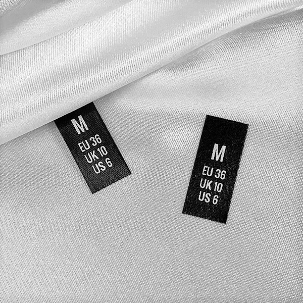 Maßgeschneiderte Etiketten mit Größen, zum Aufnähen von Kleidungsstücken oder verschiedenen Kleidungsstücken, auf Bestellung aus hochwertigem Textilmaterial gefertigt. Dieses Modell eines Textiletiketts wird mit den modernsten Technologien im Bereich des Digitaldrucks auf Textilmedien hergestellt. Die Etiketten werden im Thermotransfer-Verfahren auf Spezialsatin gedruckt, das sich durch eine beeindruckende Druckqualität und hohe Waschbeständigkeit auszeichnet. Die gedruckten Etiketten werden automatisch entsprechend den angegebenen Maßen geschnitten.