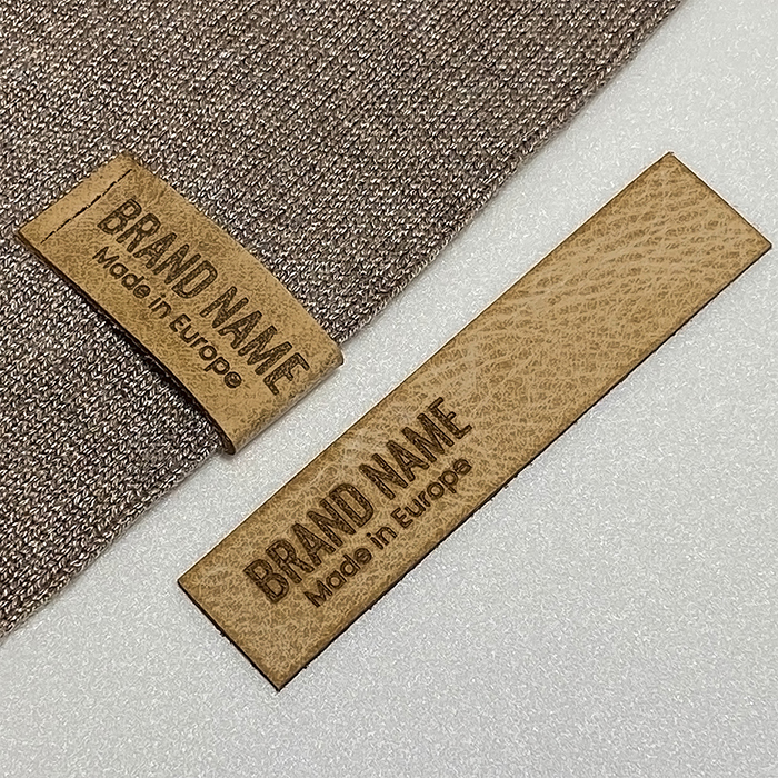 Personalisiertes Etikett EP-M46 aus Naturleder für Kleidung, Taschen, Schuhe und verschiedene Bekleidungsaccessoires.